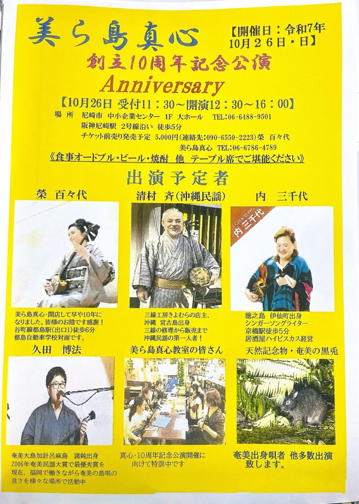 平素より(株)美ら島真心へ格別のご支援・ご協力を賜り、厚く御礼を申し上げます。美ら島真心も都島区の地で「奄美島料理・黒糖焼酎・奄美シマ唄教室」を通して「奄美に少しでも貢献」をモットーにに開業して創立10周年の記念すべき年を迎えることができ... -