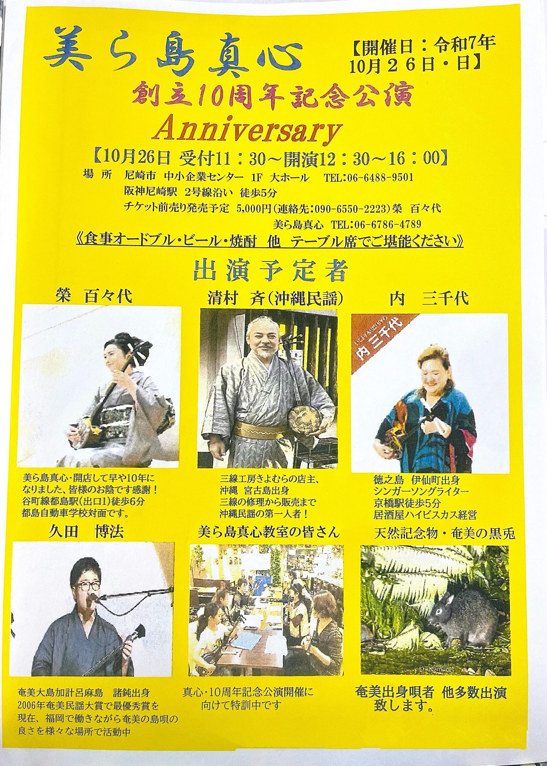 平素より(株)美ら島真心へ格別のご支援・ご協力を賜り、厚く御礼を申し上げます。美ら島真心も都島区の地で「奄美島料理・黒糖焼酎・奄美シマ唄教室」を通して「奄美に少しでも貢献」をモットーにに開業して創立10周年の記念すべき年を迎えることができました。つきましては、下記の日程にて、10周年記念公演ライブを開催致します。ご飲食しながらライブをご堪能いただければ幸いに存じます。